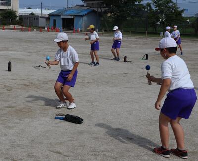 月・水・金曜の業間休みには、運動委員の当番の児童が朝礼台前に集合し、けん玉教室を開いています。
