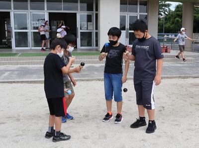 6年生ではソーシャルディスタンスをとりながら、なわとびやけん玉に取り組みました。