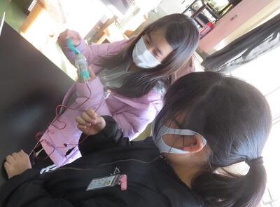 8日から埼玉県にも緊急事態宣言が発令されました。文部科学省や県、市の教育委員会からも、合唱やリコーダー演奏等は、宣言が解除されるまで停止との指導がありました。そのため、ホースを接続しないで指づかいだけ練習しているのです。