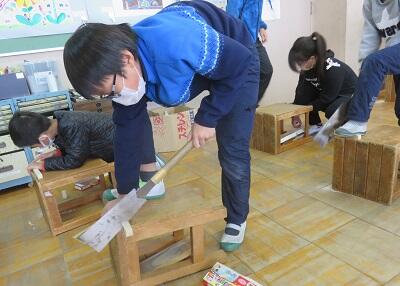 4年生が図工の授業でのこぎりを使っています。細長い棒状の角材をそれぞれの思いの部分で切っています。出来た木片をつなぎ、何かの形をつくるようです。どんな作品ができるのか楽しみですね。