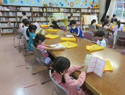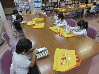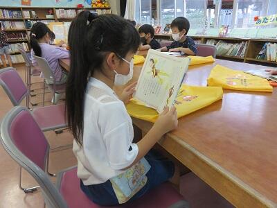 1年生が、右側を静かに歩いていました。だれもしゃべっていません。すばらしい!最後尾について一緒に歩いていくと図書室に着きました。先生の話を聴いてから、読みたい本を選び、席に着き、本を読み始めました。だれもしゃべりません。