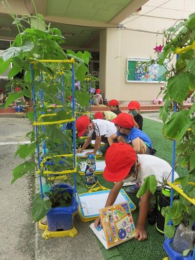 1年生が朝顔の観察をしていました。毎朝、水やりをやって育てている朝顔。すでに種ができている鉢もありました。