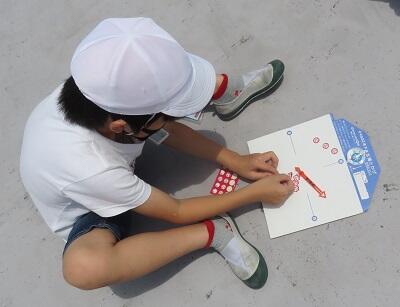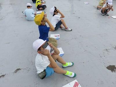 7月に入って雨続き。日時計での観察がず~~~っとできていませんでした。今日の天気は、晴れたり曇ったり。とにかく日時計を置いてみようということで、各自、屋上に日時計をセッティング。1時間ごとに観察しています。