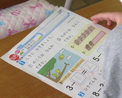 1年生が算数のテストをやり、答え合わせをしていました。確認のため、担任の先生がブロックを使って解説してくれました。