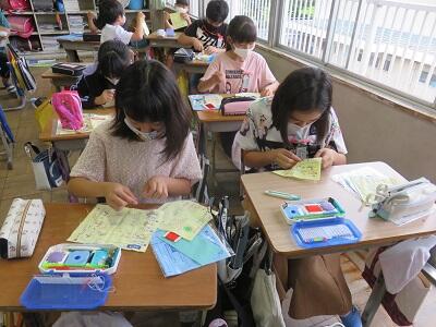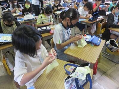 5年生の家庭科は、ボタン付けをやっていました。教室に行くと5人の先生が動いていました。心配して担外の先生が応援に来ていたようです。手先が思うように動かず苦戦中の子が多く見られました。しばらくは、毎日、玉止めや玉結びの練習が必要ですね。「毎日20個くらい、玉止めを作る」を家庭学習にするといいですね。