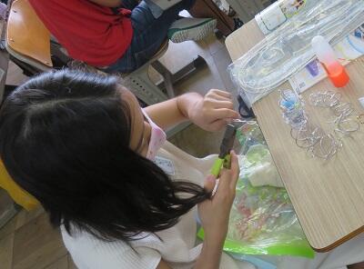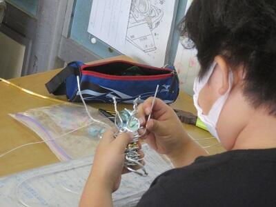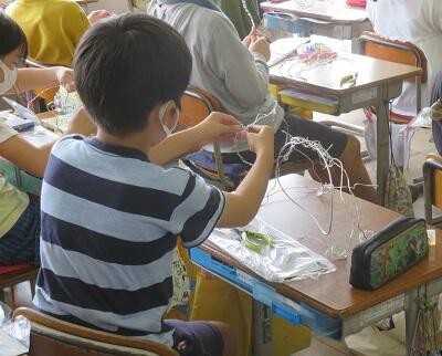 5年生は図工で「見つけて!ワイヤードリーム」という単元をやっています。アルミ製のはり金を空き缶や鉛筆などに巻いてコイル状にしたり、折ったり、つなげたりして創作活動を楽しんでいました。ペンチを使ってはり金を切ることもやっていました。