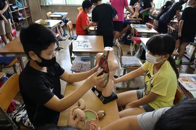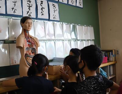 模型や人形を使って 「胃はここかな」「腸はどことつながっているかな」など