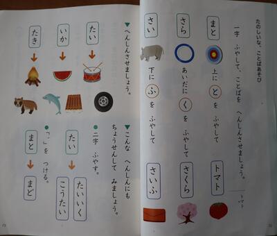 「まと」に「と」をふやして「とまと」など ことばを変身させ 発表していました
