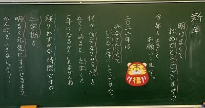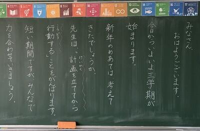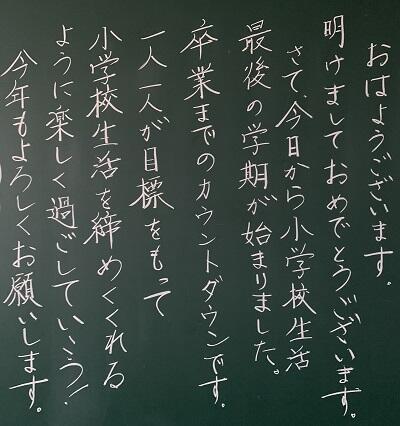朝、校舎内をまわってみると、どの教室にも担任の先生から子どもたちへのメッセージがかかれていました。登校した子どもたちは、だまって黒板の文字を読んで、にっこりしていました。