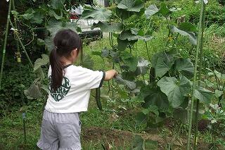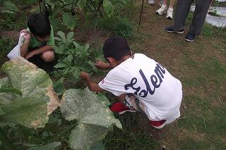 2年生では、学校園で大きく育った野菜の収穫を順番に進めています。今日は、ナスやキュウリ、オクラを子供たち自身の手で収穫しました。