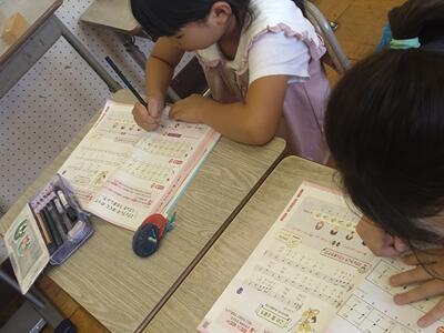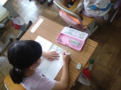 1時間目の途中から雨が降ってきました。外遊びが大好きな低学年は、朝の自由遊びはできましたが、業間休みは室内で過ごしました。何をしているのかなと見に行くと、自由帳に絵を描いたり、◯✕ゲームを描いたり、本を読んだりして過ごしていました。