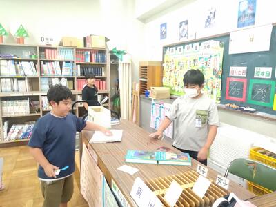 こちらは図書室です。雨の日はいつもより混んでいます。読書貯金をクリアしていくとしおりがもらえます。図書委員も忙しそうです。