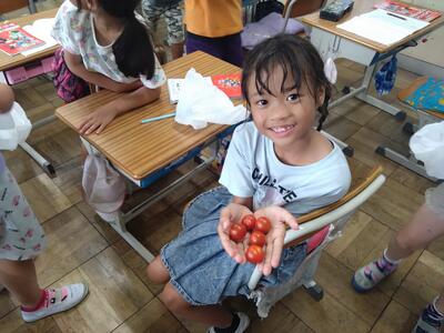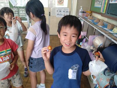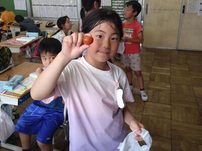 2年生が植木鉢やファームで育てている野菜が収穫真っ盛りです。ミニトマトやキュウリ、ピーマンが次々と食べごろを迎えて、クラスで順番に持ち帰っています。ピカピカの野菜と同じように満面の笑顔がいっぱいです。