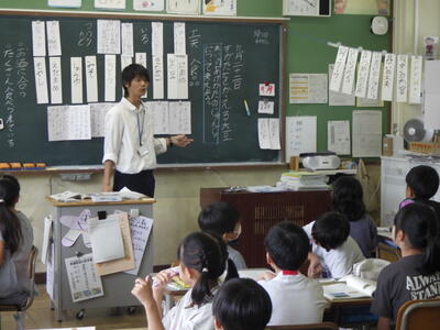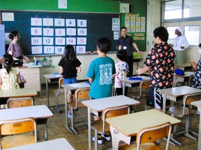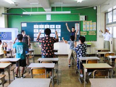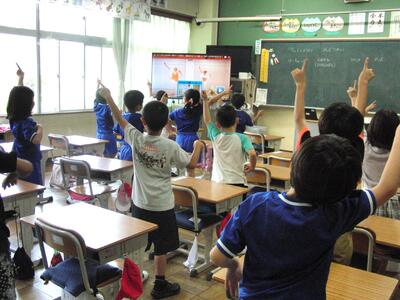 毎週水曜日は、英語専科、指導助手、ALTの3人で外国語の授業を行っています。5・6年生は月曜日と合わせて週2時間、3・4年生は週1時間、1・2年生となかよし学級は月に1時間程度の授業を行っています。久しぶりのなかよし学級の外国語は、歌とジェスチャーを組み合わせて、ナンバーの読み方に挑戦していました。