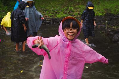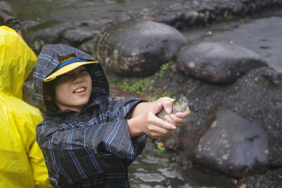 やっぱり降ってきました・・・雨にも負けずヤマメのつかみ取りです。