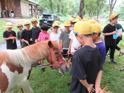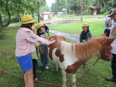自分たちで取ったヤマメが焼けるまで、ポニーと触れ合って待ちましょう。