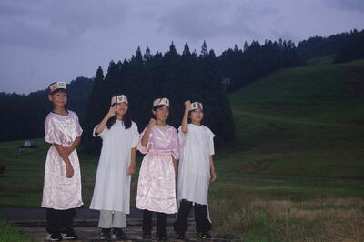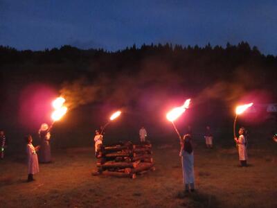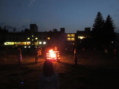辺りが暗くなり、夜のお楽しみキャンプファイヤーです。火の子たちも気合が入ります。火の神が登場し、炎が燃え上がりました。