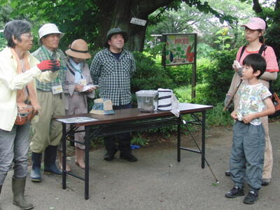 久しぶりに涼しい週末を迎えたこの日は、ビオトープの観察にもってこいの日でした。生態系保護協会の方から、まずはハチの生態の説明をしていただき、もしハチがいたら刺激をしないようにというアドバイスがありました。
