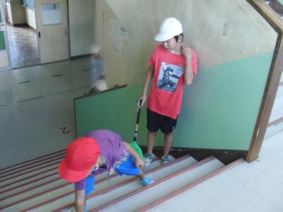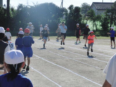 積極的に外遊びをしてもらおうと、運動委員会が企画したのは障害物競争です。コースの途中に障害物を置いて、各学年ごとに日替わりで楽しんでもらいます。初日は1年生でした。一人で何回も走って、時には運動委員のお兄さんと競争して、思い切り体を動かすことができました。運動委員も積極的に声をかけて1年生をやる気にさせてくれました。