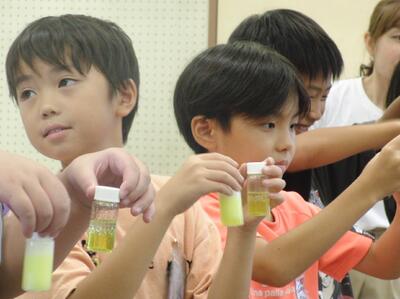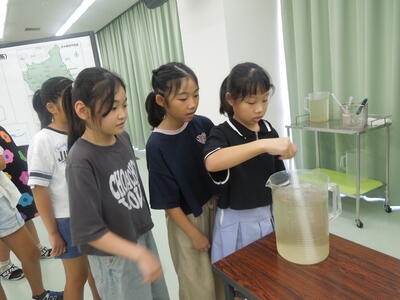 2年生は算数の「かさ」で入れ物に入る水の量を調べました。