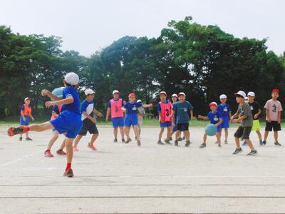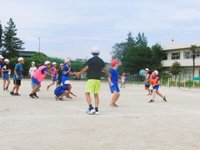 最後に全員で「みんなにとどけ!勝利の元気玉!」です。6年生が大玉の方向を左右からサポートして、ぐんぐん前に進めたいところですが、触りたいみんなの手が出てくると、思うように進みません。それが面白いところです。