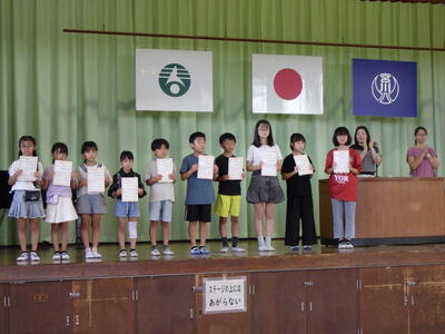 はじめに、夏休みから2学期にかけてたくさんの作品応募があり、それらに出品した子どもたちの表彰を行いました。この日は、11月に行った校内読書月間にちなんで、読書マラソン、読書感想文、図書館の本を使って調べるコンクールの表彰をしました。