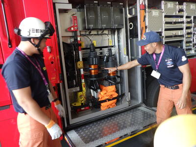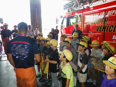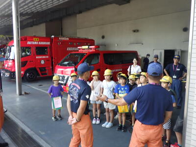 春日部消防本部・消防署では、ガラス越しに通信指令室の様子を見ながら、春日部市の消防体制について詳しく説明していただきました。「今日も救急車はフル稼働です」と聞いて忙しい仕事の様子を実感しました。出動回数や通報回数など、数値のデータをクイズで質問されると、思った以上の多さに驚きや発見がありました。役割の異なる消防車が車庫にずらりと並び、かっこいい~と思わず見とれました。火を消す以外にも人を助けるレスキューの道具を実際に使って見せてくれました。消防隊員のみなさんは、とても明るく楽しく説明をしてくれました。