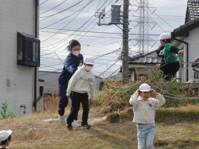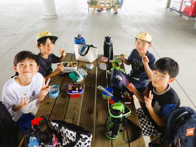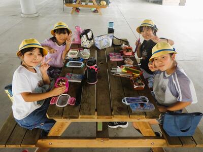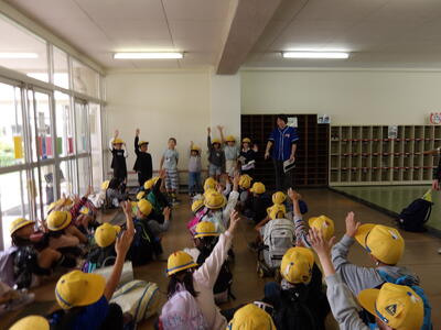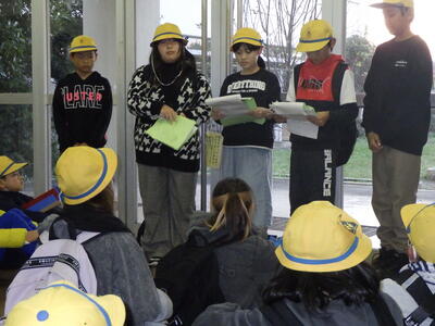 最後に雨雲が広がってきたので帰り道が心配でしたが、少し早めに学校に到着しました。校舎の窓からお兄さん、お姉さんたちが「お帰り~!」と出迎えてくれました。到着式では、1日を振り返る発表もできました。