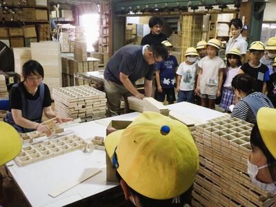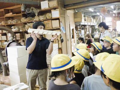 松田桐箱では、桐箱作りの歴史や作り方の説明がありました。昔はたくさんあった桐の木が今は少なくなり、中国から輸入しているそうです。実際に工場に入ると、大型機械での作業と人の手作業の特徴がよく分かりました。工場ででる木の削りカスも環境に良い方法で処分したり、別の使い方をしたり、SDGsに取り組んでいることも分かりました。