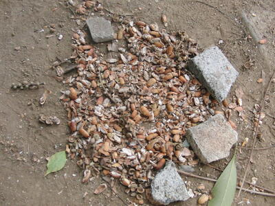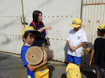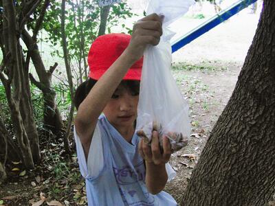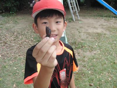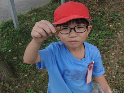 1年生が築山の周りや大木の下に集まって、秋の様子を探していました。宮川小の木々は緑が濃く、まだ紅葉は進んでいません。それでも、一部の落ち葉は赤や黄色や茶色になって落ちています。どんぐりも毎日たくさん落ちます。どれだけ集めてもなくなりません。茶褐色になったバッタ、セミの抜け殻、ガの抜け殻まで・・・なんでも興味津々の1年生です。