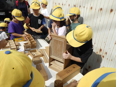 公開授業に引き続き、5年1組では先生が全員で参観する研究授業が行われました。総合でエコ米作りについて探究している中で、藁(わら)の用途を調べ、それを活かす活動に至り、現在は藁の家づくりにチャレンジしている真っ最中です。家といっても大きなものではありませんが、構造や手順など考える内容はたくさんあります。試みて失敗して改善する。これを繰り返しながら一人一人が真剣に取り組んでいることが伝わってきました。