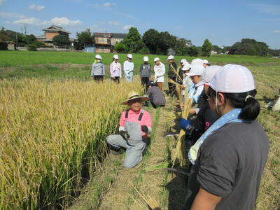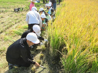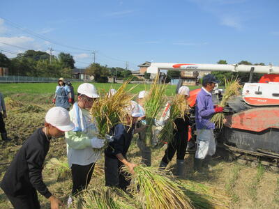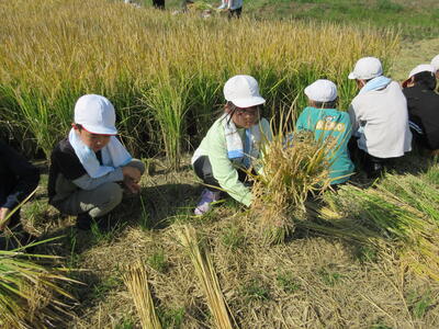 今年も稲刈りの日がやってきました。農業ボランティアさんは、酷暑やイネカメムシの影響を心配していましたが、宮川田んぼの稲を無事に管理していただきました。田植えと同様に、2名の稲刈りボランティアさんも来てくださり、丁寧に教えてくれます。本当にありがとうございます。子どもたちは稲刈り用の大きなカマを使って、ザクッザクッと刈り取っていきます。難しいのは束ねて縛る作業です。しっかり縛らないと束がほどけてしまいます。昔の人々はすべて手作業でやっていたので、その大変さを想像しながら、取りこぼしがないように頑張りました。