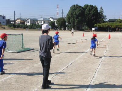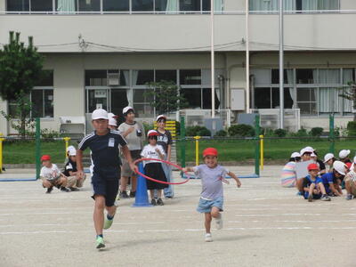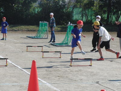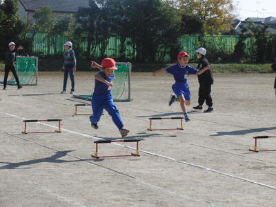 積極的に外遊びをしてもらおうと、運動委員会が企画したのは障害物競争です。コースの途中に障害物を置いて、各学年ごとに日替わりで楽しんでもらいます。初日は1年生でした。一人で何回も走って、時には運動委員のお兄さんと競争して、思い切り体を動かすことができました。運動委員も積極的に声をかけて1年生をやる気にさせてくれました。