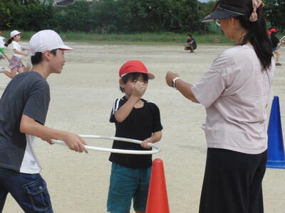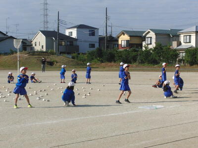 宮川小の運動会の特色の一つは、縦割り班対抗のレク種目があり、地域の方たちにも参加してもらうことです。スピード勝負ではなく、ジャンケンの運試しで「最強運」のチームが決まります。今日のロング昼休みは、全校で練習をしました。初めて種目に参加する1年生は練習でも思い切り楽しんでいました。