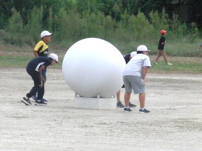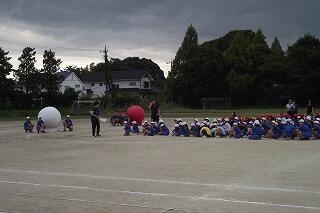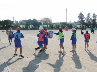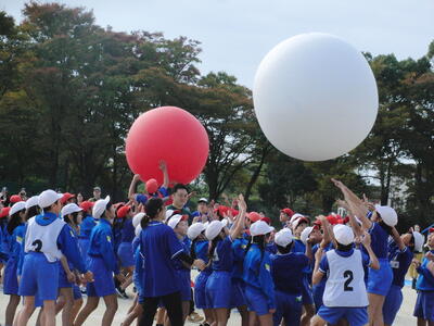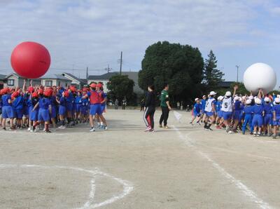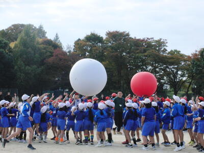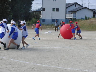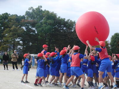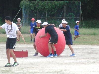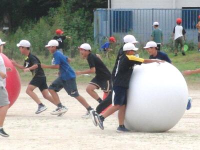 最後に全員で「みんなにとどけ!勝利の元気玉!」です。6年生が大玉の方向を左右からサポートして、ぐんぐん前に進めたいところですが、触りたいみんなの手が出てくると、思うように進みません。それが面白いところです。