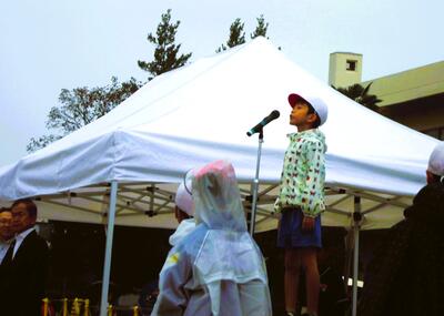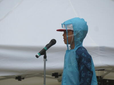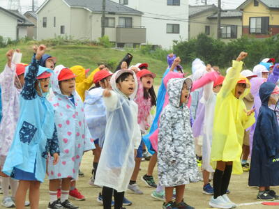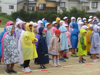 開会式は霧雨を肌で感じながら始まりました。代表児童が力強くめあてを発表し、『ゴーゴーゴー』を力いっぱい歌いました。