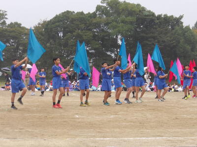 5・6年生『輝く絆~5・6年生の友情~』は、肩を組み円陣での声出しから始まりました。9月からダンスリーダーが中心になって考えた振付を一人一人が個性豊かに踊りました。リーダーは朝礼台の上でオリジナルの動きをして面白かったです。後半は集団でタイミングを合わせてのフラッグフォーメーションです。繰り返し練習した隊形移動も、キレイに決まりました。