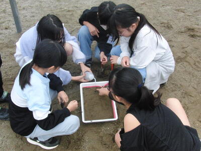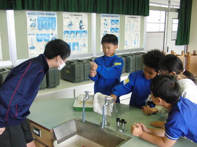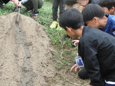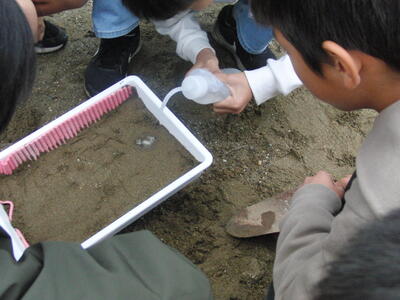 4年生が自転車講習を受けている校庭の端っこに5年生が集まってきました。見に行くと理科の実験が始まるところでした。流れる水が土地の形をつくる再現です。身近には砂が体積した河原や地層が露わになった崖などはありませんが、なぜそのような土地の形ができるのかを考えるための実験です。実験ではありましたが、子どもたちは砂遊び感覚で楽しんでいました。