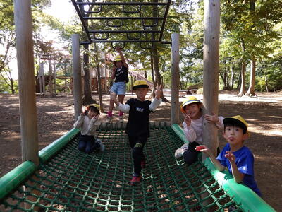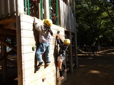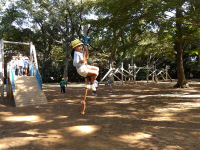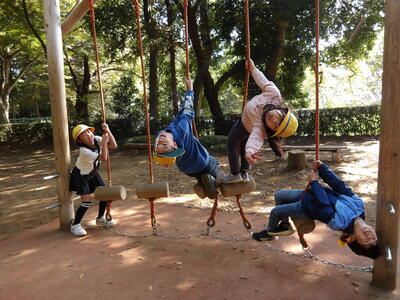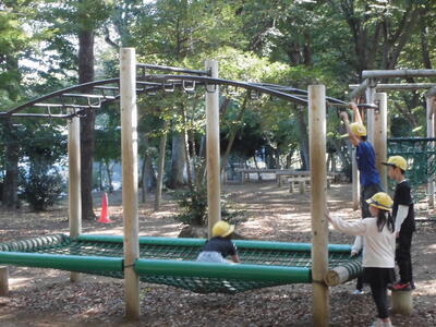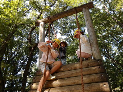 さっそく1・2年生混合のグループ行動が始まりました。アスレチックエリアには、たくさんの遊具があり、2年生のリーダーを中心にグループで遊ぶ順番を決めたり、大丈夫と声をかけたりしながら遊びました。