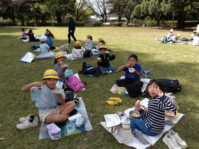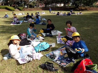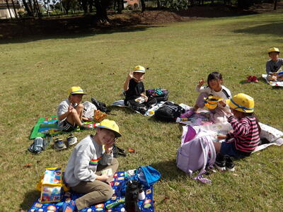 広場に移動してお弁当タイムです。見て見て私のお弁当!ぼくのはこんなにいっぱい!あちらこちらから聞こえてきました。