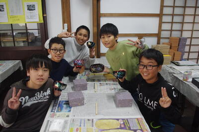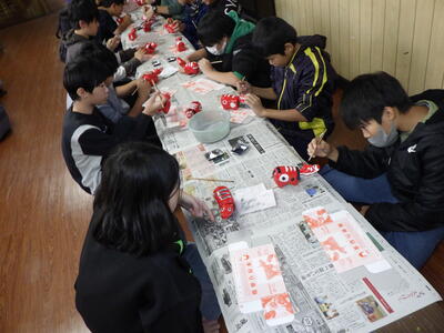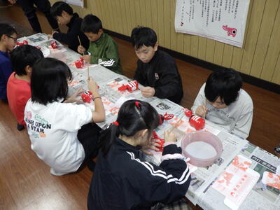 ホテルに行く前にもう一つのお楽しみ。赤べこの絵付け体験をしました。思い思いに模様や記念の文字を入れて、マイ赤べこが完成です。
