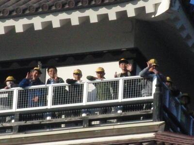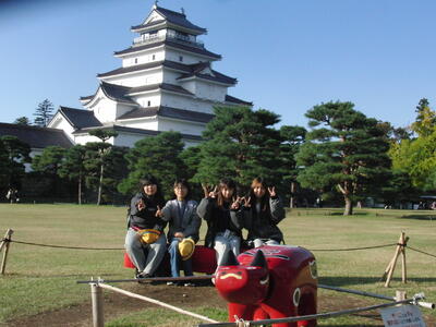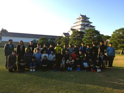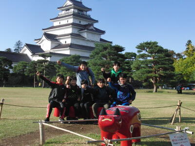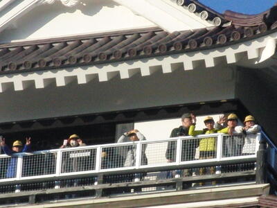 グループ活動のゴールは鶴ヶ城です。青い空に白いお城がよく映えてきれいでした。天守閣から元気に手を振っています。