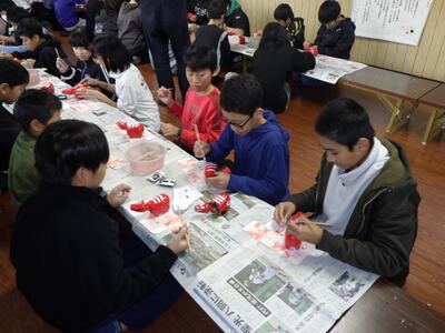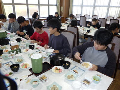 子どもたちは「赤米おいしいね」「タコ(大凧に見立てた蛸ステーキ)、うまっ!」「藤うどん、入ってる!」と頬張り、お替わりもしている子もいました。クレヨンしんちゃんのステッカーが付いたお米のムースもあと2、3個食べられそうな勢いでした。