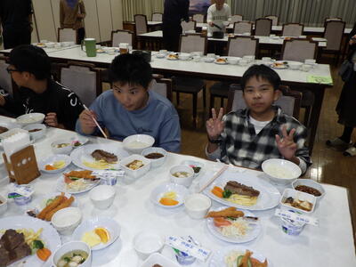 さあ、目の前にはおいしい夕食が並んでいます。今日のメインはステーキです!福島の美味しいお米はおかわりOKです。ステーキの他にも副菜がたくさんあり、白米がどんどん進みました。