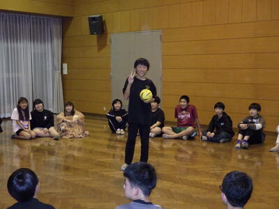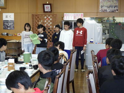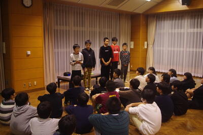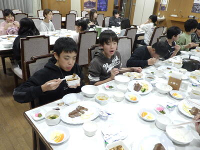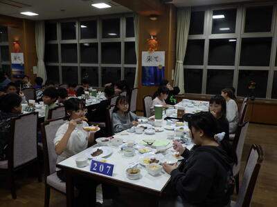 夕食の後、少し休憩して、お風呂の時間です。みんな口々に「気持ちよかった」「温泉サイコー」と言っていました。お風呂の後は、短い時間ですがレクタイムです。係が準備したゲームやクイズで楽しいひと時を過ごしました。