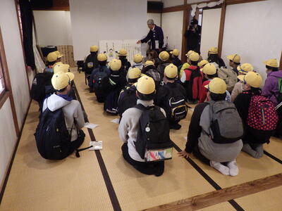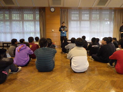 寒くなると暖房を使うようになり、空気が乾燥することから、火災が起こりやすくなります。今日は寒空の下、校庭に避難する火災の避難訓練を行いました。1年生も1学期よりスムーズに行動していました。避難後、代表の児童と先生方が実演し、火が燃えているのを発見した児童が先生を呼び、水消火器を使う様子を見ました。子どもにも、大人を呼ぶ、周りに知らせるという大切な役割ができます。家族でも火事にならないように気を付けることを話し合ってほしいです。