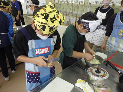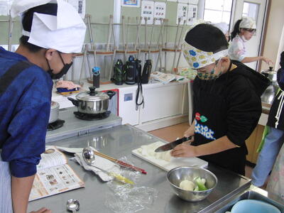 6年生はジャガイモを使った調理をします。実習ではジャーマンポテトを作りました。ジャガイモの皮むきや芽取りが下準備の大事なポイントです。下茹でをして、玉ねぎとベーコンと炒め、おいしく出来上がりました。