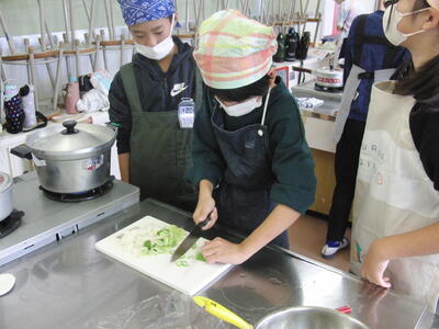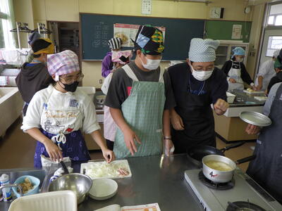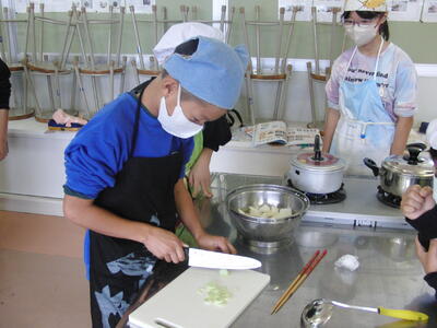 給食で何度か食べている宮川米。5年生が自分たちで収穫した宮川米を初めて調理実習で炊きました。合わせて、みそ汁の調理もします。炊飯器のスイッチ一つで炊きあがるのではなく、鍋で火加減を調整しながら炊くのは難しいです。みそ汁の具材は大根とねぎです。身に付けているエプロンは、ミシン学習で完成したものです。