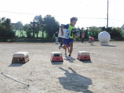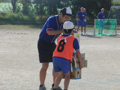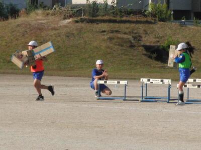 3・4年生「miyazon配達員」は、大切な荷物を運びながら、いくつもの障害物を超えて、お届け先にサインをもらってゴールです。