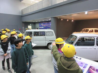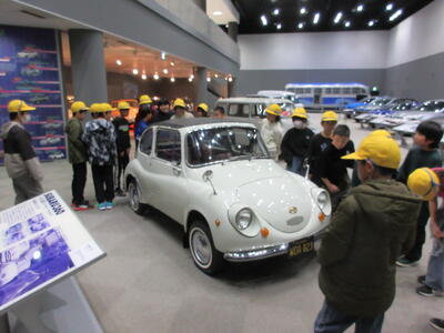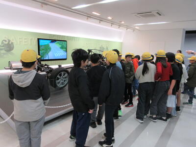 SUBARUは予約を取るのが大変ですが、担任や他の先生方ががんばったおかげで、見学することができました。日本中、世界中に産業の中心である自動車を送り出している工場の迫力を間近で感じることができました。また、展示室では、自動車の進化や環境への配慮についても学びました。